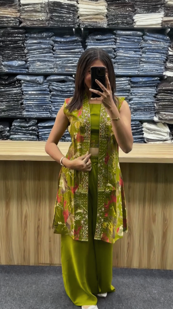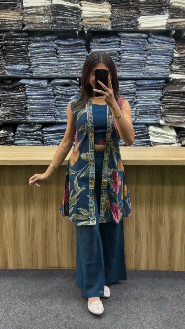 This trendyย ย co-ord setย features a sleeveless inner top, wide-leg pants, and a long printed jacket with ethnic-style embroidered bordersย ๐Ÿ’—๐ŸŒบ.
